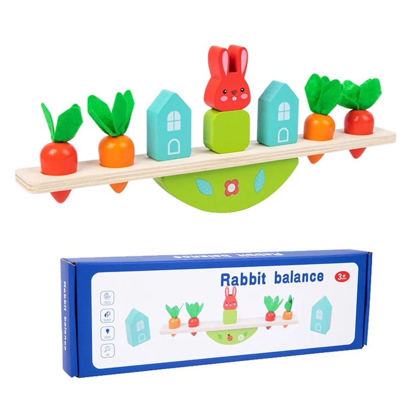 Odkryj fascynujący świat równowagi z naszą drewnianą zabawką Montessori "Króliczek i Przyjaciele"! Ta urocza gra polega na układaniu kolorowych klocków (króliczka, marchewek i domków) na drewnianej belce, tak aby utrzymać ją w równowadze.