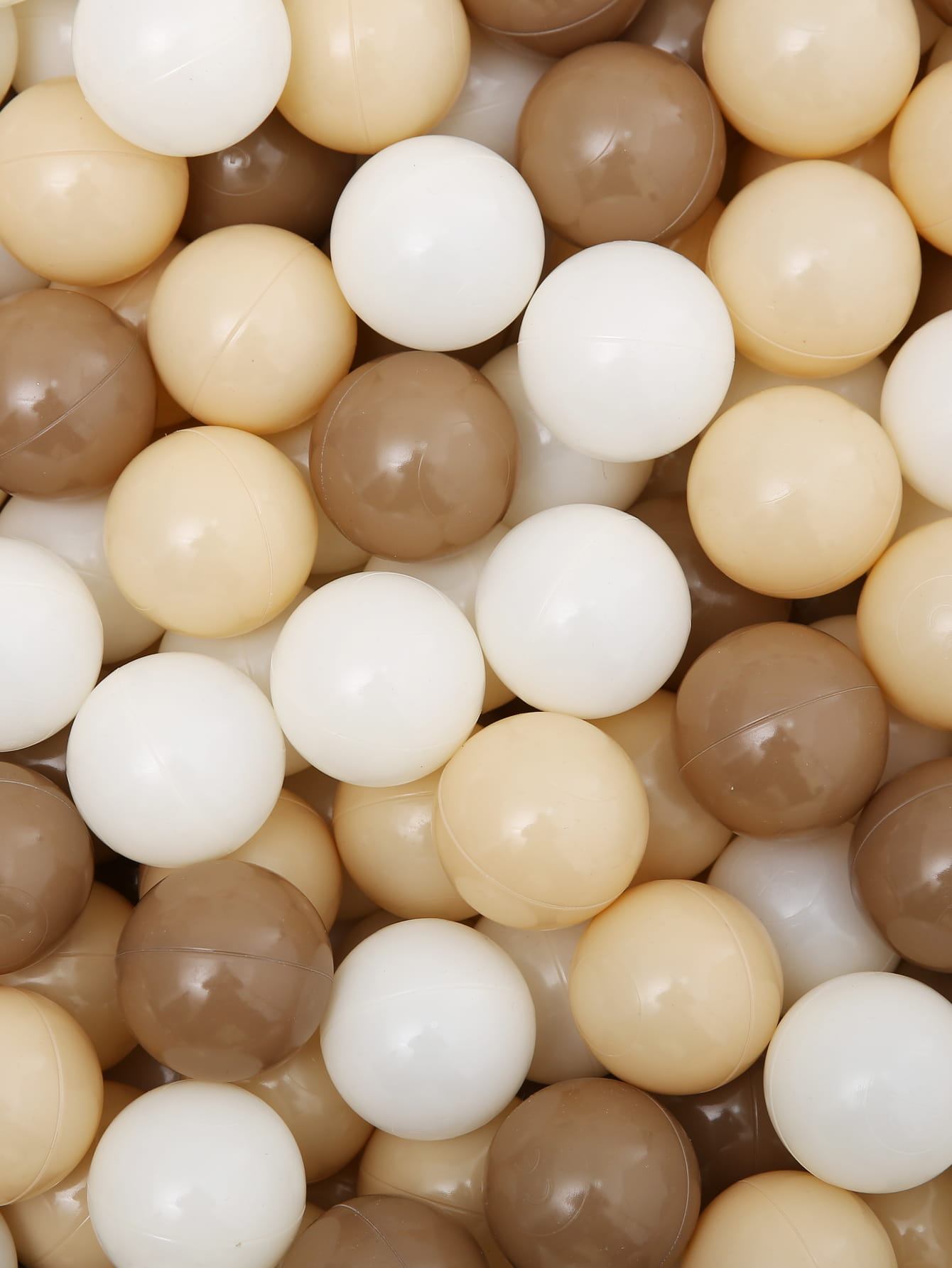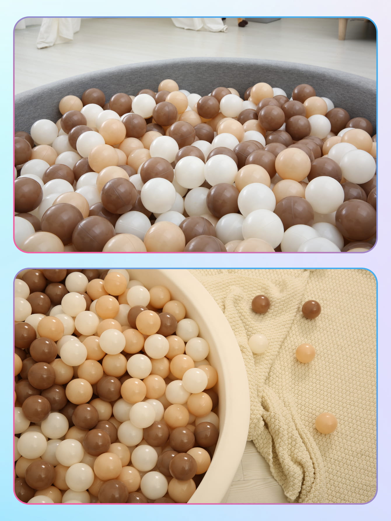 Zestaw 100 sztuk piłek do suchego basenu, wykonanych z pogrubionego, bezpiecznego materiału PE. Miękkie, gładkie i elastyczne – idealne do zabawy dla niemowląt i małych dzieci. Dzięki stonowanej, neutralnej kolorystyce (odcienie beżu, kremu, brązu) piłki świetnie komponują się z nowoczesnym wnętrzem i pasują do większości basenów piankowych lub nadmuchiwanych.