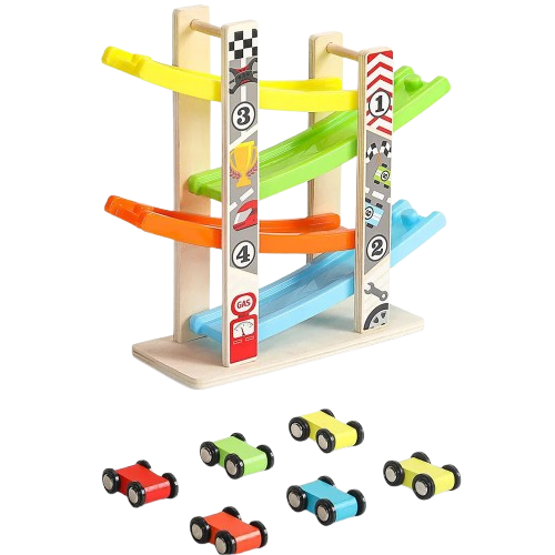 Kolorowa drewniana zjeżdżalnia z 6 samochodzikami to gwarancja świetnej zabawy i rozwoju dla każdego małego fana motoryzacji. Sprawdź, który samochodzik najszybciej pokona cały tor!