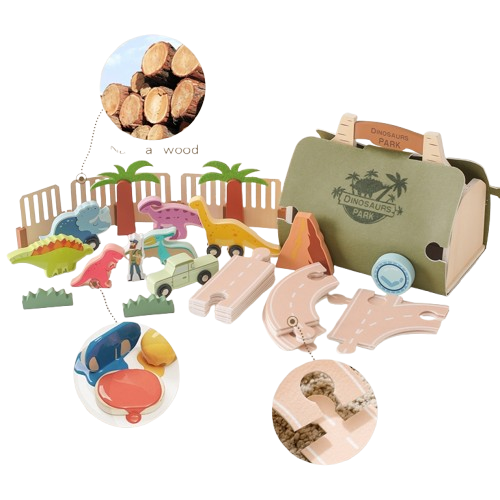 Odkryj magiczny świat dinozaurów z drewnianym zestawem Dino Park! Zestaw do zabawy i nauki, który dziecko może zabrać wszędzie – zamienia się w poręczną walizeczkę. Idealny dla małych miłośników prehistorii i kreatywnej zabawy!