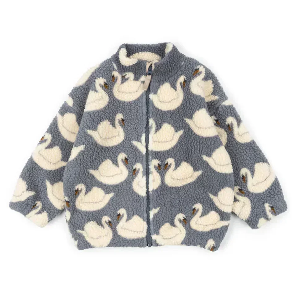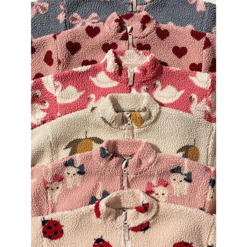 Stylowa i ciepła kurtka dla dziewczynek, idealna na chłodniejsze dni jesieni i zimy. Wykonana z miękkiego materiału typu „teddy” (wełna/plusz), zapewnia ciepło i wygodę noszenia. Kurtka posiada praktyczny suwak na całej długości, który ułatwia szybkie ubieranie i zdejmowanie. Różnorodne wzory (łabędzie, kotki, biedronki, serduszka) nadają jej uroku i sprawiają, że dzieci chętnie ją zakładają.