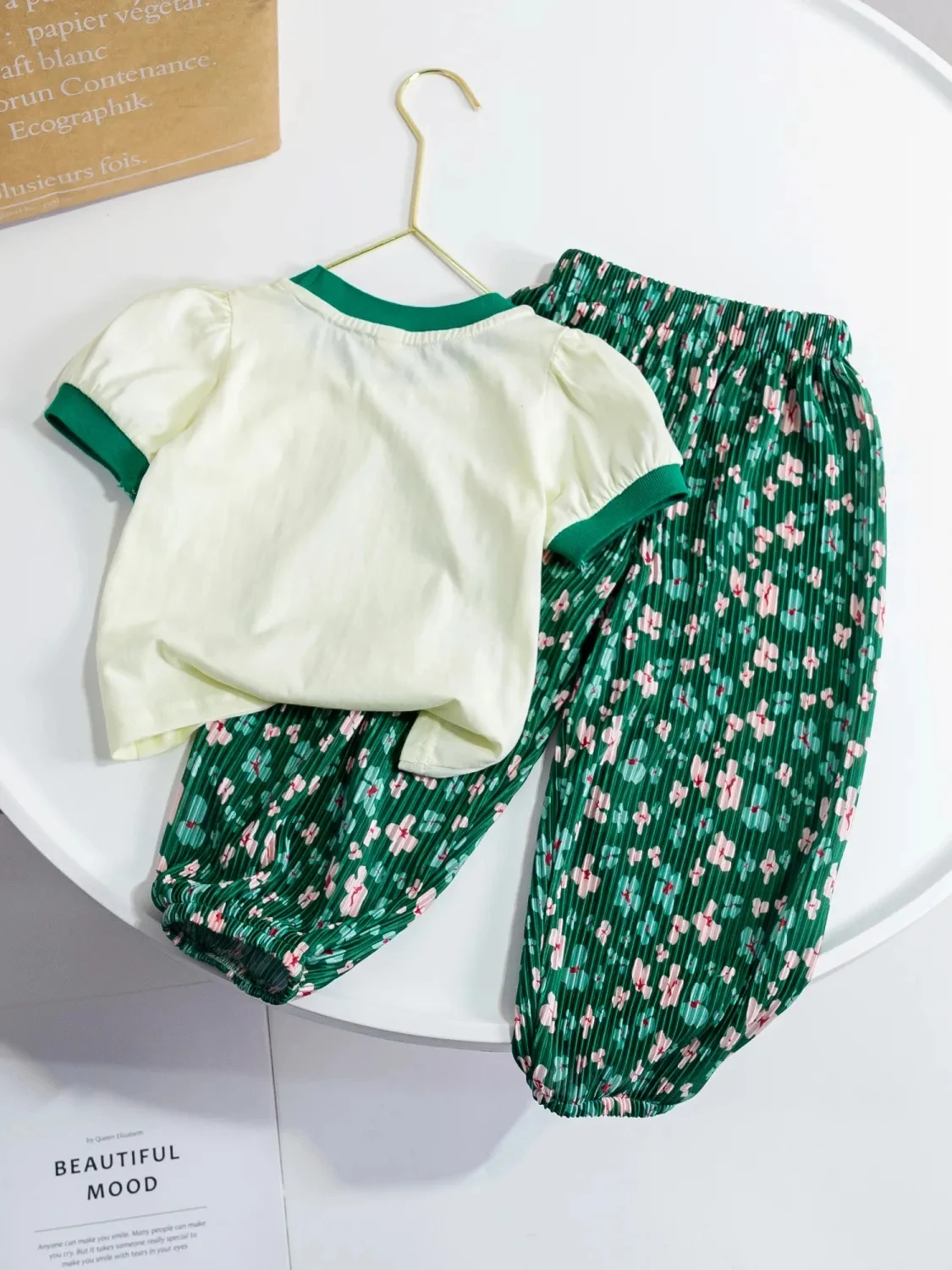 Praktyczny i uroczy zestaw dziecięcy, składający się z wygodnej koszulki z krótkim rękawem i lekkich spodni z elastyczną talią. Idealny na wiosenne i letnie dni, zapewnia komfort oraz swobodę ruchów podczas zabawy i codziennych aktywności.