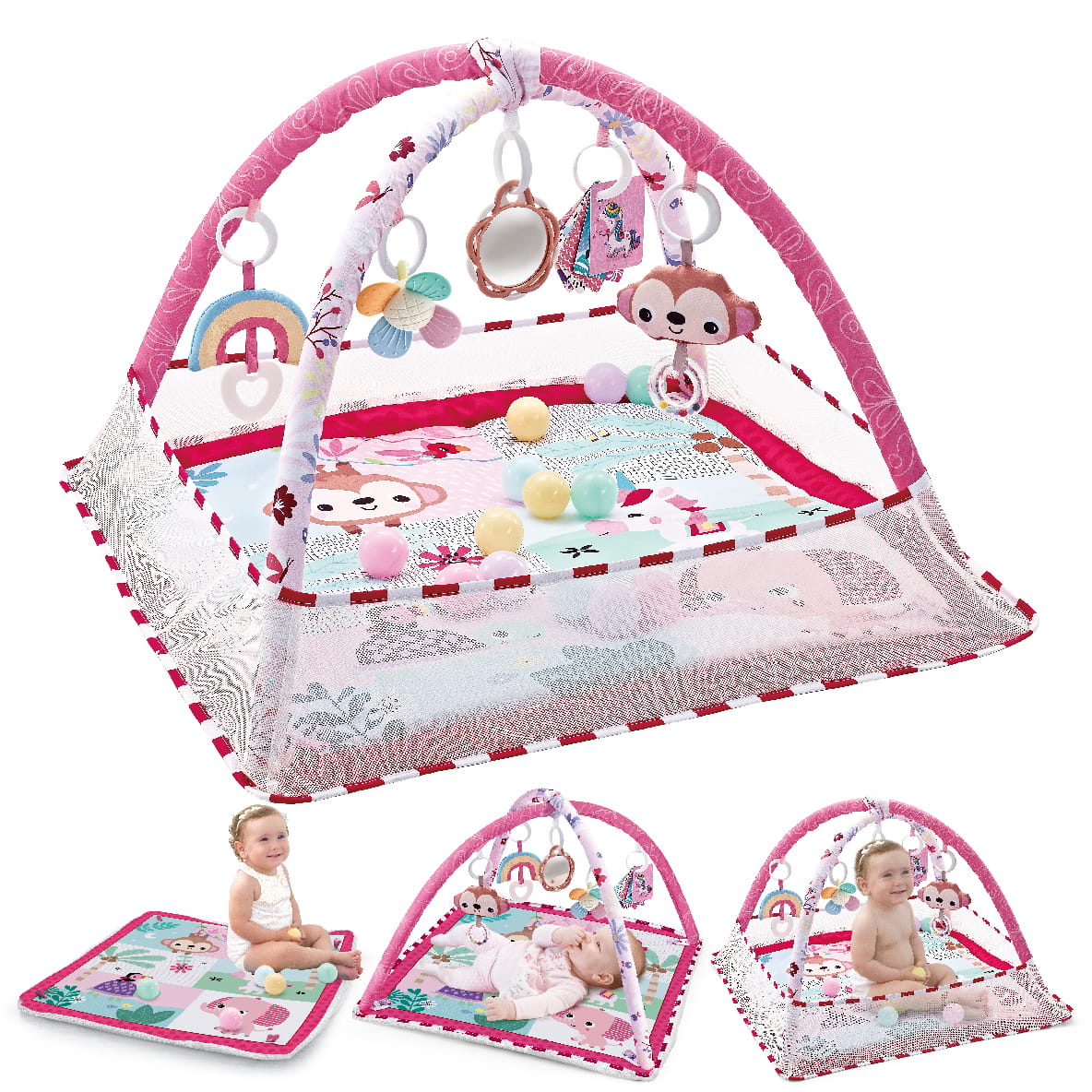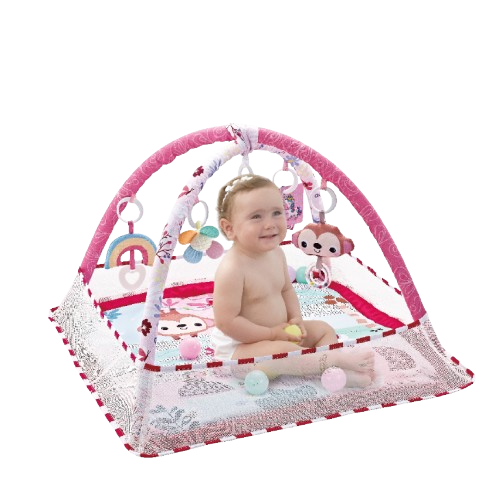 Interaktywna mata edukacyjna z pałąkiem i zabawkami to idealne miejsce do zabawy i rozwoju Twojego dziecka już od pierwszych miesięcy życia. Miękka, bezpieczna i kolorowa powierzchnia z miękkim ogrodzeniem z siatki oraz bogaty zestaw zabawek sensorycznych wspierają rozwój motoryki, zmysłów i koordynacji.