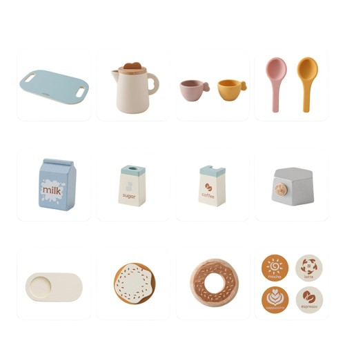 Realistyczne akcesoria: kartonik mleka, cukier, filiżanki, łyżeczki, taca, kawa, ciastka i ekspres