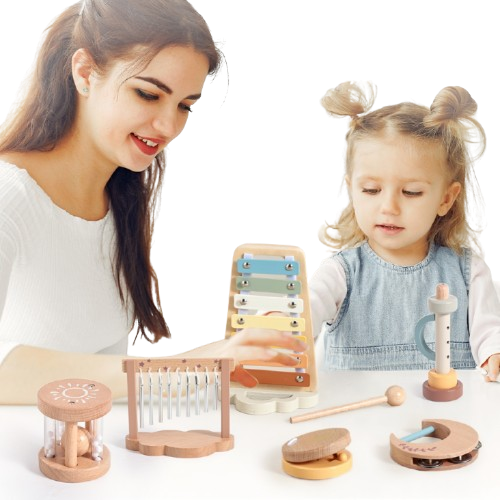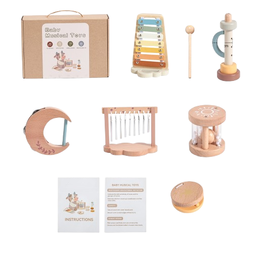 Rozbudź muzyczną wyobraźnię dziecka z pięknym zestawem drewnianych instrumentów! Naturalne drewno, pastelowe kolory i bezpieczne materiały sprawią, że Twoje dziecko pokocha pierwsze dźwięki i rytmy.