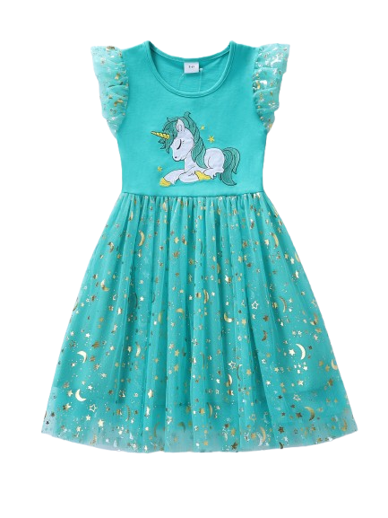 Odkryj wyjątkową sukienkę z motywem jednorożca, która zachwyci każdą małą fankę bajkowych stylizacji. Dostępna w trzech kolorach: różowym, turkusowym i czerwonym. Lekka, przewiewna tkanina i efektowna tiulowa spódnica z błyszczącymi gwiazdkami i księżycami sprawiają, że sukienka doskonale nadaje się na każdą okazję – od codziennych spacerów po rodzinne uroczystości.