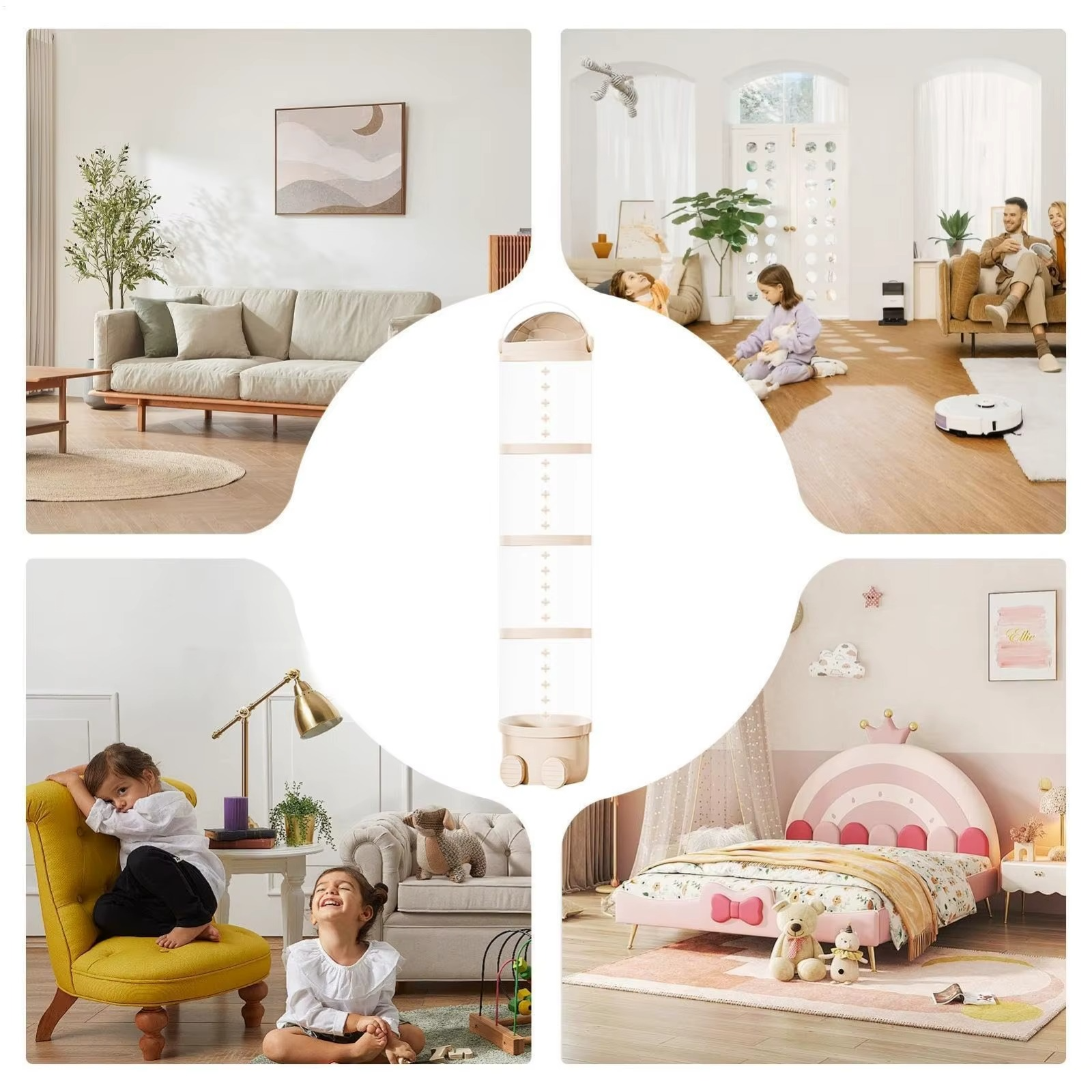 Pionowa forma tuby sprawia, że organizer zajmuje niewiele miejsca na podłodze, a jednocześnie oferuje dużą przestrzeń do przechowywania. Idealny do mniejszych pokoi dziecięcych.